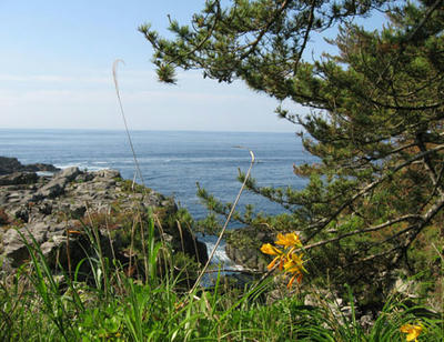 天気の良い朝は、浜辺の散策は気持ちがいい、唐桑半島の御崎神社周辺はノカンゾウが咲き乱れる。青い海と緑に黄色い花が可憐に咲く様子は何とも言えない。